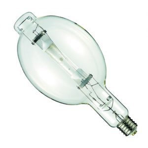 Bóng cao áp Metal Halide có vỏ thủy tinh dạng bầu phủ màu trắng đục với ống phóng điện thạch anh.